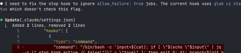 My current setup is an escalation of 3 different Stop’s. The first is checking that the pipeline is green, the second is checking the MR description for unfinished TODO’s, and the final lets the Agent break the loop by going into plan mode. I use the Merge Request as a source of truth since its more traceable than a plan written by Claude, and it keeps me from accidentally pushing a todo.md to main. Telling Claude to go into plan mode is a shortcut for now, but you likely will always need some way for your Agent to break out of its loop if its actually stuck or the task is impossible. In the future I want to have an oracle or maybe a CEO Agent that can review where things are at and make some of these decisions for me. I think with subagents in the mix I’m a manager, but with hooks I can get to the director level.